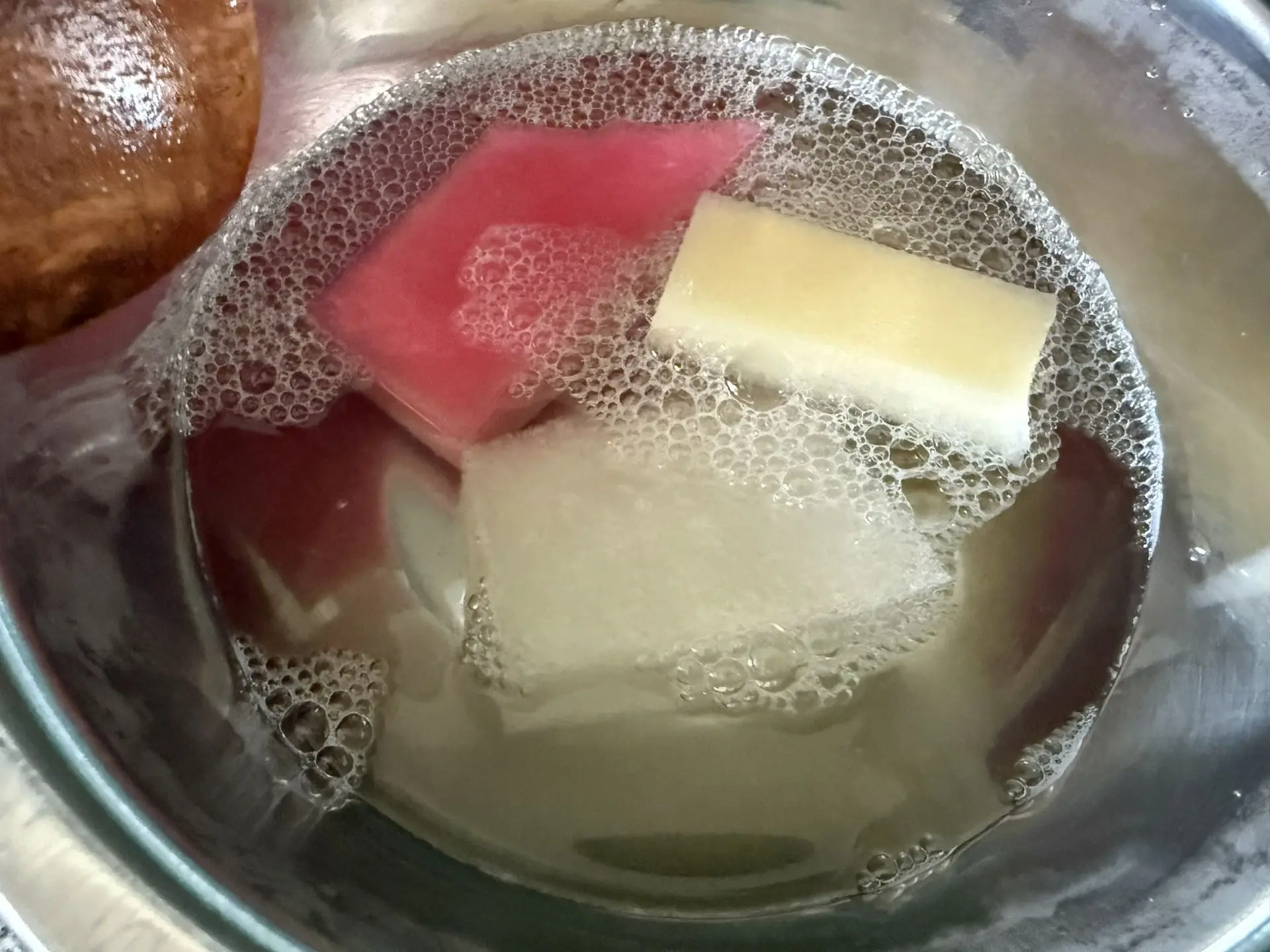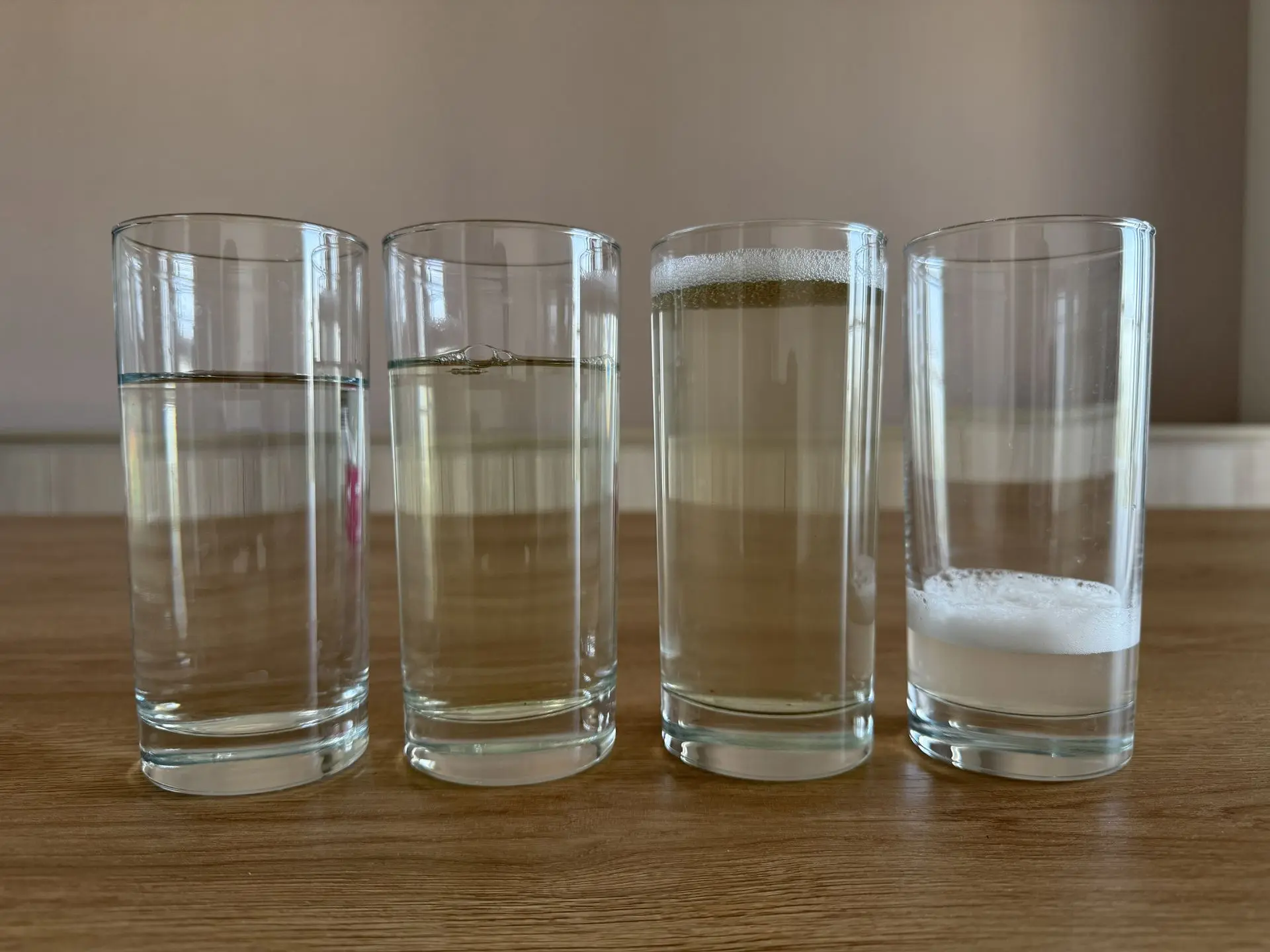 Foam soaking test results left to right: Clear water, Water with detergent, Water with detergent after 10min soaking, Water with solvent based thinner after 10min soaking.